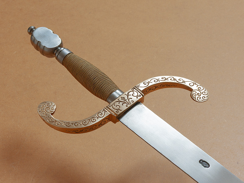 Longueur totale : 76 cm, longueur lame : 56,5 cm Poids: 1390 g Garde décorée, poignée en bois recouverte de fil de laiton torsadé lame émoussée |